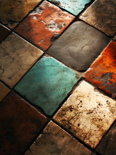 Plakat z serii wnętrza zatytułowany Ceramiczna Kompozycja, przedstawia starannie ułożone, wielokolorowe płytki ceramiczne, które razem tworzą hipnotyzującą kompozycję. Kontrastujące tekstury i kolory płytek - od gorących pomarańczy i czerwieni, przez chłodne błękity, po ziemiście beżowe i szare tony - przypominają o bogatej palecie barw, jakie oferuje natura. Subtelne odbicie światła dodaje głębi i wizualnego zainteresowania, powodując, że wzór wydaje się niemal dynamiczny. Plakat ten mógłby stanowić fascynujący element dekoracyjny w każdym wnętrzu, szczególnie w tych, które celebrują sztukę rzemiosła i naturalną paletę kolorów, jak salony, przestrzenie wspólne, a nawet galerie sztuki.