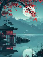 Plakat z serii motywy wschodnie zatytułowany Japoński Pawilon. Ten plakat emanuje spokojem dzięki scenie przedstawiającej tradycyjny japoński pawilon, otoczony przez wodę i delikatnie pochylające się czerwone liście klonu. Ciepłe światło wschodzącego księżyca i subtelne odbicie w wodzie podkreślają atmosferę ciszy i refleksji. Delikatne sylwetki przelatujących ptaków dodają element życia i ruchu. Plakat ten idealnie wpisuje się w przestrzenie współczesne, minimalistyczne, a także te, które celebrują naturę i spokój, takie jak pokoje do medytacji, jadalnie, czy też poczekalnie w spa.