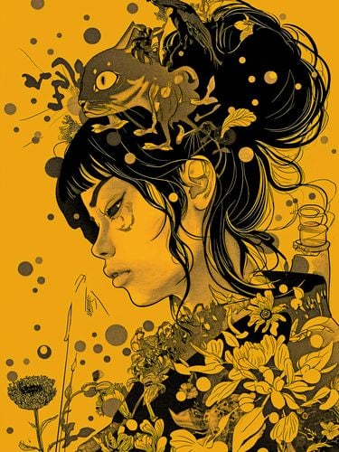 Plakat z serii motywy wschodnie zatytułowany Jedność prezentuje profil portretu młodej kobiety, którego kontury i przestrzeń wokół są wypełnione bogatym, złożonym motywem fauny i flory. Czarno-złota kolorystyka na tle w odcieniach musztardowego żółtego tworzy głęboki kontrast, który przyciąga wzrok i zmusza do refleksji. Włosy kobiety przechodzą w gęstą dżunglę roślin i zwierząt, symbolizując jedność z przyrodą. Wizualnie wyraziste i symbolicznie nasycone, dzieło artystyczne wydaje się idealne do wystroju nowoczesnych przestrzeni mieszkalnych lub miejsc publicznych, które chcą podkreślić związek z naturą i sztuką. Może być również doskonałym dodatkiem do galerii lub przestrzeni artystycznych, które cenią sobie oryginalność i głębię wizualną.