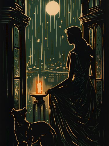Plakat z serii pejzaże zatytułowany Nocne Szeptanie. Zadziwiająca sylwetka kobiety stojącej na balkonie, skąpana w świetle księżyca, jest podkreślana przez delikatne kontury jej sukni. Obok niej, wierny towarzysz w postaci kota, czuwa nad otoczeniem. Spokojna atmosfera miejskiej nocy na tle zorzy oraz migoczące gwiazdy nadają kompozycji niezwykłego uroku i głębokiej kontemplacji. Świetnie sprawdzi się w cichych kącikach czytelniczych, hotelowych lobby oraz w miejscach dedykowanych relaksowi i medytacji.