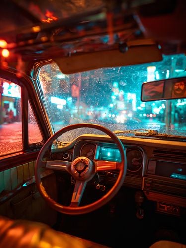 Plakat z serii pop art zatytułowany Nocny Kierowca, przedstawia widok z wnętrza klasycznego samochodu, patrząc przez deszczową, skraplaną szybę na rozświetlone neony miejskiego pejzażu nocą. Ciepłe, czerwone oświetlenie wnętrza samochodu kontrastuje z hipnotyzującym błękitem i elektrycznymi odcieniami świateł zewnętrznych, tworząc intymną, a jednocześnie dynamiczną atmosferę. Kropelki deszczu na szybie dodają tekstury i głębi, sprawiając, że scena jest zarówno realistyczna, jak i liryczna. To dzieło sztuki mogłoby znaleźć swoje miejsce w przestrzeniach nowoczesnych, miejskich loftów lub jako akcent w barze o tematyce retro, wprowadzając element tajemniczości i miejskiego romansu.