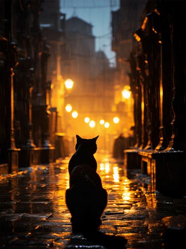 Plakat z serii wnętrza zatytułowany Samotna Wędrowczyni. Kontur czarnego kota stojącego na mokrej, brukowanej uliczce, oświetlonej jedynie żółtym blaskiem lamp ulicznych, tworzy atmosferę tajemniczości i refleksji. Deszcz spadający na tle starych budynków dodaje uczucia nostalgii i melanholii. Ten kocur, jakby strażnik nocy, symbolizuje samotność i odwagę w konfrontacji z niewiadomym. Świetnie sprawdzi się w kawiarniach, księgarniach oraz w salonach o industrialnym charakterze wnętrza.