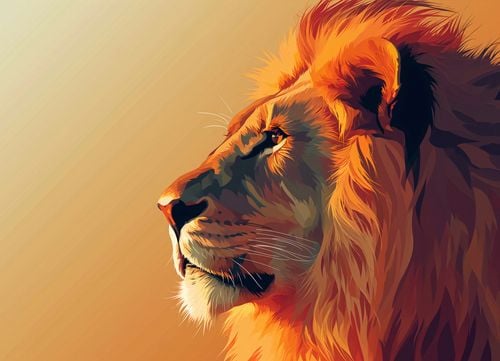 Plakat z serii abstrakcja zatytułowany Król. Ukazuje profil lwa, króla zwierząt, w stylizowanej, cyfrowej ilustracji z wykorzystaniem żywych, ciepłych barw przypominających zachód słońca. Silny kontur głowy lwa, w połączeniu z bogatą kolorystyką jego grzywy, tworzy potężny wizerunek godności i siły. Gradiacja barw od złota po głęboki pomarańcz i brąz nadaje tej grafice dynamizmu i życia, a delikatne przejścia kolorów podkreślają majestatyczny charakter tego wspaniałego zwierzęcia. Plakat ten idealnie wpasuje się w przestrzenie, które pragną podkreślić siłę, odwagę i szlachetność, takie jak gabinety, salony, a także przestrzenie wspólne, gdzie może zainspirować i przypominać o dzikiej i nieokiełznanej naturze.