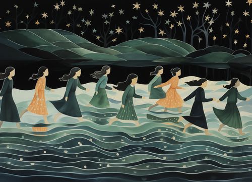 Plakat z serii wnętrza zatytułowany Nocna Procesja, przedstawia sylwetki kobiet, idących w rytmicznym ruchu przez wody, pod tajemniczym, gwiaździstym niebem. Styl plakatu, z płynnymi liniami i miękkimi pastelowymi kolorami, tworzy uczucie spokoju i onirycznej atmosfery. Postacie są przedstawione w ruchu, z włosami rozwianymi przez nocny wiatr, co dodaje dziełu poczucia tajemnicy i ruchu. Ten plakat idealnie nadaje się do wnętrz, które chcą wyrazić poczucie spokoju, introspekcji oraz kobiecej siły i solidarności, takich jak prywatne biblioteki, pokoje medytacyjne, a także przestrzenie publiczne, które pragną inspirować swoich gości do głębszego zastanowienia się nad otaczającym ich światem.