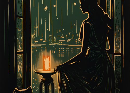 Plakat z serii pejzaże zatytułowany Nocne Szeptanie. Zadziwiająca sylwetka kobiety stojącej na balkonie, skąpana w świetle księżyca, jest podkreślana przez delikatne kontury jej sukni. Obok niej, wierny towarzysz w postaci kota, czuwa nad otoczeniem. Spokojna atmosfera miejskiej nocy na tle zorzy oraz migoczące gwiazdy nadają kompozycji niezwykłego uroku i głębokiej kontemplacji. Świetnie sprawdzi się w cichych kącikach czytelniczych, hotelowych lobby oraz w miejscach dedykowanych relaksowi i medytacji.