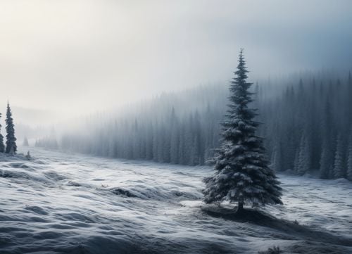Plakat z serii pejzaże zatytułowany Samotna Choinka. Ta grafika ukazuje malowniczy, zimowy krajobraz z dominującą pojedynczą, okazałą choinką pokrytą śniegiem. Otoczona przez delikatnie zasnutej mgłą lasy, podkreśla spokój i majestatyczną ciszę zimy. Delikatne odcienie błękitu i bieli tworzą wrażenie chłodu i spokoju. Ten plakat będzie idealnym dodatkiem do każdego wnętrza, gdzie chcemy wprowadzić atmosferę spokoju i kontemplacji, świetnie sprawdzi się w przestrzeniach takich jak gabinety relaksacyjne, spa, a także jako element dekoracyjny w domowych salonach lub sypialniach.