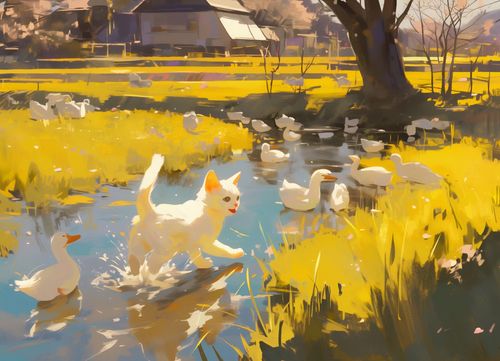 Plakat z serii abstrakcja zatytułowany Słońce na Wsi. Przedstawia idylliczną, słoneczną scenę na wsi, gdzie głównymi bohaterami są bawiący się kotek i grupa kaczek w tle. Kot, o białym umaszczeniu z jasnymi plamami, jest uchwycony w ruchu, co nadaje scenie dynamiki. Kaczki spokojnie pływają po lustrzanej tafli wody, otoczonej przez żywo żółtą trawę, co tworzy kontrast z białym kotem. Światło słoneczne rozświetla scenę, nadając jej ciepły, przyjemny nastrój. Plakat ma wyraźnie impresjonistyczny charakter, z luźnymi pociągnięciami pędzla i żywymi plamami kolorów, co czyni go atrakcyjnym dla tych, którzy cenią sobie wiejski spokój i piękno natury. Idealnie pasowałby do wnętrz, które mają na celu stworzenie atmosfery relaksu i spokoju, jak pokoje dzienne, przestrzenie odpoczynkowe, a nawet pokoje dla dzieci.