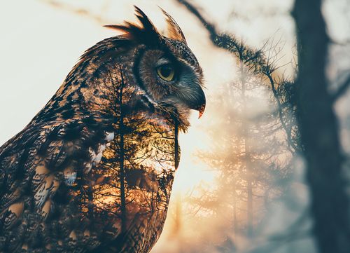 Plakat z serii natura zatytułowany Sowi Duch. Prezentuje on majestatyczną sylwetkę sowy zlewaną z tłem o zachodzie słońca w lesie, co podkreśla jej dziką naturę i instynktowną mądrość. Ciepłe odcienie zachodzącego słońca i sylwetki drzew przenikają się z delikatnym konturem sowy, tworząc wrażenie jedności z naturą. Plakat ten idealnie wpasuje się w przestrzenie takie jak gabinet, biblioteka lub salon, gdzie może inspirować do refleksji i spokoju, przypominając o głębokich, nieodkrytych aspektach natury.