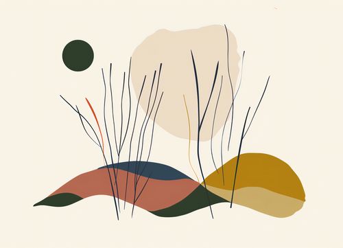 Plakat z serii boho zatytułowany Szept Wiatrów. Grafika przedstawia abstrakcyjny pejzaż, w którym finezyjne, czarne linie wyobrażają łagodnie kołyszące się trawy. Kształty w ciepłych odcieniach ziemi tworzą iluzję wzgórz i ścieżek, a dyskretna zielona kropka w górnym rogu zdaje się być echem oddalającego się słońca lub zapowiedzią zmierzchu. Wszystko to ujęte na tle delikatnego beżu, co nadaje dziełu spokojny, relaksujący nastrój. Plakat ten idealnie wpasuje się w wnętrza, które aspirują do wyciszenia i harmonii z naturą, jak przytulne salony, jadalnie, czy miejsca przeznaczone do medytacji. Może być również pięknym, uspokajającym dodatkiem do biur, bibliotek czy innych przestrzeni wymagających skupienia i spokoju.
