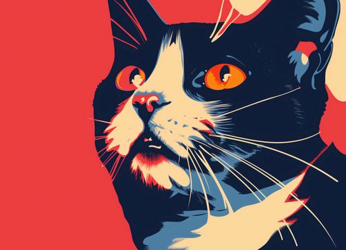 Plakat z serii abstrakcja zatytułowany Szok. Plakat przedstawia zbliżenie na twarz kota w stylizowanej, graficznej formie. Przeważającym kolorem jest intensywny czerwony, który stanowi tło dla sylwetki kota. Wyraziste, żółte oczy zwierzęcia przyciągają uwagę, a ich niemal hipnotyzujący wzrok jest skierowany ku widzowi. Wizerunek kota jest zróżnicowany kolorystycznie: od ciemnych odcieni, poprzez szarości, aż po żywe akcenty błękitu i pomarańczy, które dodają dynamiki i głębi. Detale takie jak wąsy i futro są wyraźnie zaznaczone białymi i niebieskimi liniami, co nadaje ilustracji ruch i teksturę. Całość kompozycji ma współczesny, prawie popartowy charakter, przyciągając wzrok i wzbudzając emocje. Jest to dzieło, które mogłoby znaleźć miejsce w nowoczesnych przestrzeniach, podkreślając miłość do zwierząt i sztuki.