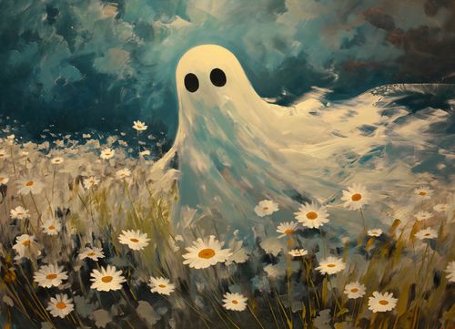 Plakat z serii abstrakcja zatytułowany Widmo Dawnej Łąki.Plakat przedstawia sympatyczną, uproszczoną postać ducha unoszącego się nad łąką pełną białych stokrotek. Duch ma duże, okrągłe oczy, co nadaje mu przyjazny wygląd. Tło to dynamicznie namalowane pociągnięcia pędzlem w odcieniach niebieskiego i brązu, co sprawia wrażenie burzowego nieba lub wschodzącej burzy. Postać ducha kontrastuje z ciemniejszym tłem, a jasne, żywe kolory kwiatów dodają kompozycji ciepła i lekkości. To połączenie elementów może symbolizować nadzieję i pokój w obliczu przeciwności, nadając plakatowi głębsze znaczenie. Idealny do dekoracji wnętrz dla osób ceniących sobie odrobinę humoru i optymizmu.