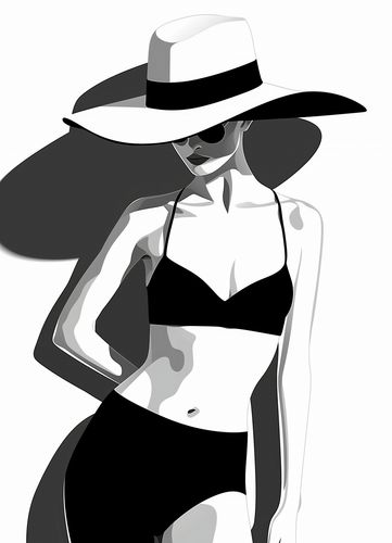 Plakat z serii abstrakcja zatytułowany Strój. Prezentuje stylizowany czarno-biały wizerunek kobiety w dwuczęściowym stroju kąpielowym. Postać odziana jest w szerokobrzmiony kapelusz, który rzuca cień na jej twarz, podkreślając elegancki i tajemniczy charakter kompozycji. Kobieta stoi w pozycji trzy czwarte, z jedną ręką opuszczoną wzdłuż ciała, a drugą lekko zgiętą w łokciu, co dodaje dynamizmu ilustracji. Plakat jest utrzymany w minimalistycznym stylu z wykorzystaniem płaskich plam kolorów i wyraźnych linii, co nadaje mu nowoczesny i modny wygląd. Ten rodzaj grafiki idealnie wpasuje się w nowoczesne wnętrza, szczególnie te o monochromatycznej kolorystyce, lub jako modny akcent w przestrzeniach o minimalistycznej estetyce.