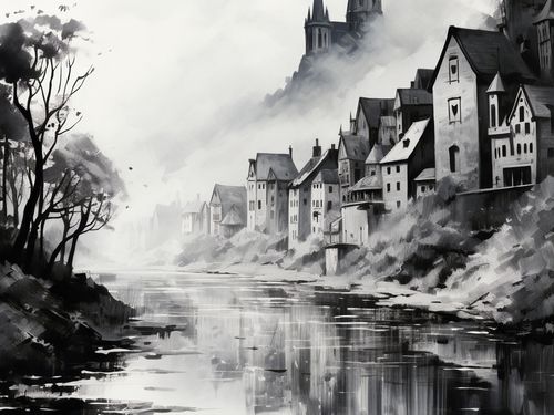Plakat z serii pejzaże zatytułowany Mglisty Refleks. Misterne pociągnięcia pędzla przedstawiają starą wieś schowaną w mrocznych zakątkach gór, z dominującymi wieżami kościoła wznoszącymi się nad nią. Mgła otulająca krajobraz i odbicie w spokojnej wodzie tworzą atmosferę tajemniczości i zadumy. Monochromatyczna paleta barw dodaje głębi i intensywności całemu obrazowi, czyniąc go idealnym wyborem dla klasycznych salonów oraz miejsc takich jak kawiarnie o historycznym charakterze czy ekskluzywne kluby dyskusyjne.