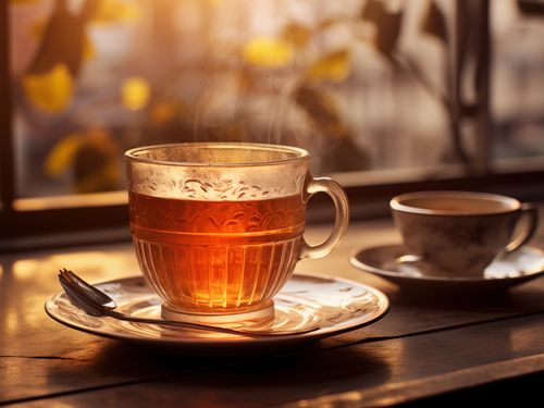 Plakat z serii wnętrza zatytułowany Moment Codzienności. Urokliwy obraz dwóch filiżanek herbaty, z których jedna uchwycona jest w chwili, gdy promienie porannego słońca przenikają przez jej bursztynową zawartość. Ciepłe światło i delikatna para unosząca się nad napojem emanuje atmosferę spokoju i przyjemności z porannego rytuału. Idealny do kuchni lub jadalni, aby dodać uczucie ciepła i domowego komfortu, a także doskonały jako prezent dla każdego miłośnika herbaty lub momentów refleksji.