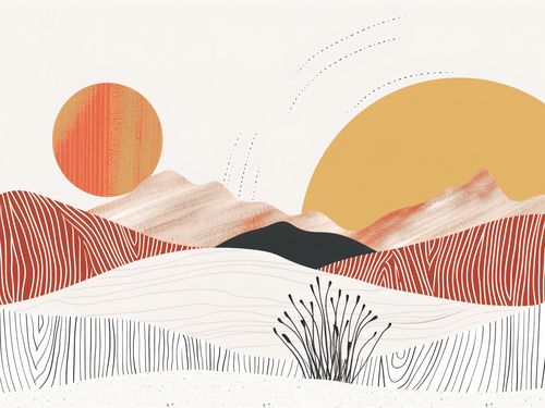 Plakat z serii boho zatytułowany Roztańczone Słońce. Plakat przedstawia abstrakcyjny pejzaż, w którym harmonia form i kolorów tworzy obraz pełen spokoju i równowagi. Jego głównymi elementami są stylizowane wzgórza, które płynnie przechodzą w miękkie linie, oraz dwa słońca, które swymi barwami ożywiają całą kompozycję. Delikatna roślinność w przedniej części dodaje głębi i tekstury, a zabawa cieniem i światłem wydobywa z plakatu uczucie ciepła.Ten plakat będzie doskonałym dodatkiem do wnętrz, gdzie pragnie się stworzyć atmosferę spokoju i odpoczynku, takich jak salony, gabinety lub pokoje gościnne. Jego subtelne barwy i proste formy wprowadzą do każdej przestrzeni odrobinę natury i ciepła.