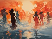 Plakat z serii wnętrza zatytułowany Taneczny Żar, przedstawia grupę osób tańczących w rytmicznych ruchach w wodzie, z tłem zapalającego się nieba w odcieniach ciepłego pomarańczu i czerwieni. Postacie są przedstawione w dynamicznych pozach, z włosami rozwianymi przez wiatr, co nadaje obrazowi wrażenie ruchu i pasji. Styl plakatu, z jego płynnymi liniami i żywymi kolorami, tworzy uczucie energii i życia. Ten plakat idealnie nadaje się do wnętrz, które chcą uchwycić esencję ruchu, radości i wolności, takich jak studia taneczne, kreatywne przestrzenie pracy, a także jako inspirujący element w domach, gdzie może stanowić przypomnienie o pięknie wspólnych chwil i celebracji życia.