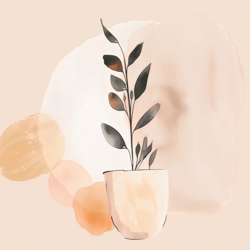 Plakat z serii wnętrza zatytułowany Doniczkowy Kolor. Plakat przedstawia minimalistyczną i stylową kompozycję roślinną na delikatnym, pastelowym tle. Centralnym punktem jest elegancka, czarno-brązowa gałązka z liśćmi w stonowanej kolorystyce, umieszczona w jasnym, beżowym doniczce o subtelnych odcieniach i delikatnym cieniowaniu. Tło składa się z miękkich, organicznych plam w odcieniach kremu, beżu i ciepłego brązowego, które tworzą efekt akwarelowy. Całość jest utrzymana w spokojnej, relaksującej palecie barw, co sprawia, że plakat ten idealnie nadaje się do przestrzeni, gdzie chcemy wprowadzić element spokoju i harmonii, jak salon czy sypialnia. Delikatność i prostota wzoru podkreślają nowoczesny charakter tego dzieła, jednocześnie zachowując ponadczasową elegancję.