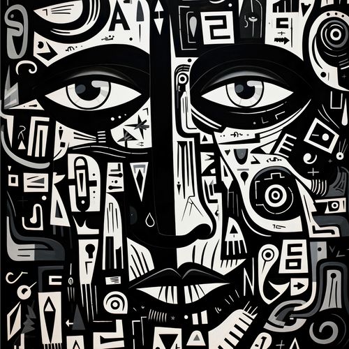 Plakat z serii abstrakcja zatytułowany Labirynt Myśli. Intrygujące oczy spoglądające z głębi obrazu są otoczone złożonymi wzorami i symbolami, które łączą się, tworząc enigmatyczny portret. Czarno-białe barwy kontrastują ze sobą, dodając dziełu intensywności i głębi. Złożoność wzorów symbolizuje skomplikowane myśli i emocje, które kryją się za ludzkim spojrzeniem. Świetnie sprawdzi się w nowoczesnych biurach, galeriach sztuki oraz w przestrzeniach przeznaczonych dla miłośników abstrakcyjnej ekspresji.