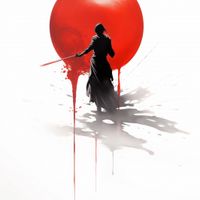 Plakat z serii motywy wschodnie zatytułowany Samotny Samuraj przedstawia postać w tradycyjnym japońskim stroju, samuraja, w dynamicznej pozie z mieczem, z potężnym, czerwonym słońcem w tle. Design wykorzystuje silne kontrasty kolorystyczne - biel i czerń z akcentami czerwieni, aby stworzyć dramatyczną i potężną wizualizację. Przedstawienie samuraja w akcji z rozpryskami tuszu naokoło podkreśla ruch i energię, a jednocześnie oddaje hołd tradycyjnym technikom japońskiego malarstwa atramentem. Ten plakat to doskonały wybór dla miłośników japońskiej kultury i sztuk walki, idealny do wnętrz nowoczesnych jak i tych o bardziej klasycznym charakterze.