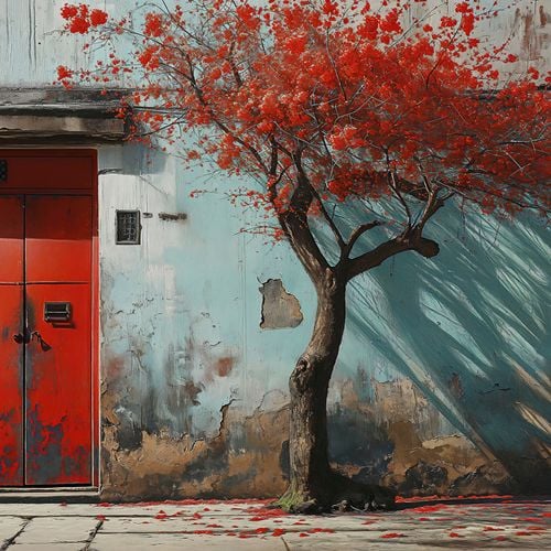 Plakat z serii wnętrza zatytułowany Widok Na Dawne. Kompozycja łączy surowość starych, połatanych ścian w stonowanych kolorach z wyrazistym czerwonym drzwiami oraz rozkwitłym drzewem o żywym karmazynowym kolorze, które zdaje się wprowadzać życie i energię do miejskiej monotonii. Promienie światła przenikające przez liście dodają głębi i tajemniczości scenie. Ten plakat doskonale wkomponuje się w przestrzenie kreatywne, galerie sztuki lub jako akcent w minimalistycznych, nowoczesnych wnętrzach, przynosząc z sobą odrobinę miejskiego romansu i poezji codzienności.