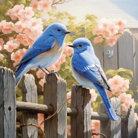 Plakat z serii natura zatytułowany Wiosna u Bram to zachwycająca ilustracja, przedstawiająca dwa błękitne ptaki, które wydają się prowadzić spokojną rozmowę, siedząc na starym drewnianym płocie. Tło kompozycji zdobią delikatne, różowe kwiaty, które tworzą romantyczny i spokojny nastrój. Subtelne światło przenika przez liście, delikatnie rozświetlając scenę i podkreślając intensywny błękit upierzenia ptaków, co przyciąga wzrok i budzi ciepłe uczucia. Ten plakat sprawdzi się jako element dekoracyjny w każdym pomieszczeniu, wprowadzając atmosferę wiosennej świeżości i naturalnego piękna. Idealny dla miłośników przyrody i delikatnej, artystycznej ekspresji.