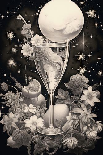 Plakat z serii wnętrza zatytułowany Kosmiczny Eliksir. Niesamowita kompozycja przedstawiająca kieliszek, z którego wylewa się galaktyczny nektar, otoczony kwiatami i roślinami w monochromatycznych barwach. Centralnym punktem jest lśniąca pełnia księżyca, której blask odbija się w szkle, tworząc atmosferę tajemnicy i magii. Gwiazdy migoczą w tle, nadając całości głębokiego, nieskończonego wymiaru. Delikatne linie i szczegóły graficzne wzbogacają kompozycję, czyniąc ją idealnym wyborem do nowoczesnych salonów, galerii sztuki oraz miejsc o tematyce astronomicznej.