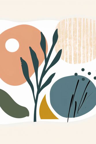 Plakat z serii boho zatytułowany Pastel Owoców.Plakat przedstawia stilizowany obraz natury, gdzie organiczne formy i kształty łączą się w nieoczywisty sposób. W kompozycji dominuje duża, pastelowa forma przypominająca owoce lub słońce, która kontrastuje z subtelnym tłem w delikatnych odcieniach beżu ozdobionym wertykalnymi liniami. Obok widnieją płynne, ciemnozielone liście oraz zaokrąglone, geometryczne formy w odcieniach szarości i musztardy, uzupełnione o subtelne graficzne akcenty. Plakat będzie pięknie komponował się w przestrzeniach poszukujących elementów natury w abstrakcyjnej, uproszczonej formie, idealnie nadając się do nowoczesnych salonów, kreatywnych przestrzeni pracy lub jako delikatny akcent w minimalistycznej sypialni.