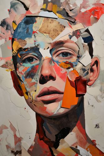 Plakat z serii abstrakcja zatytułowany Podział Samego Siebie, przedstawia twarz złożoną z rozmaitych, nieregularnych kawałków, które łączą się w zaskakująco spójną całość. Każdy fragment jest jak pociągnięcie pędzla, pełne tekstury i żywych kolorów, od ciepłych odcieni pomarańczy i czerwieni, po subtelne biel i brąz. Wzrok widza jest przyciągany do intensywnych, realistycznych oczu, które wydają się obserwować z za rozdrobnionej mozaiki. Plakat ten mógłby znaleźć swoje miejsce w nowoczesnych galeriach sztuki, studiach projektowych, lub jako odważny akcent w minimalistycznych, współczesnych przestrzeniach. Jego abstrakcyjny, ale wyrazisty design stwarza punkt konwersacyjny i może być interpretowany jako komentarz do złożoności ludzkiej tożsamości i percepcji.