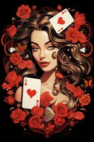Plakat z serii abstrakcja zatytułowany Różany Hazard. Ta bogato zdobiona grafika przedstawia portret kobiety z królewskim spokojem, otoczoną przez wirujące karty z sercami i rozkwitające czerwone róże. Jej włosy płynnie przechodzą w kwiatowe motywy, a spojrzenie jest pełne tajemnicy i uroku. Motyle i drobne perełki dodają kompozycji element fantazji i delikatności. Wszystko to na tle głębokiej czerni, która eksponuje intensywność kolorów i detali. Plakat ten jest idealny dla przestrzeni, które chcą dodać element romantyzmu i wyrafinowania, jak eleganckie sypialnie, prywatne kolekcje czy luksusowe salony. Jego barwna paleta i symboliczne elementy sprawiają, że jest to dzieło, które przyciąga wzrok i pobudza wyobraźnię.