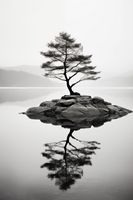 Plakat z serii pejzaże zatytułowany Samotne Drzewo to monochromatyczne zdjęcie prezentujące unikalną scenę – pojedyncze drzewo wyłaniające się z kamiennej wysepki na tle spokojnej, lustrzanej powierzchni wody. Plakat jest ujęciem w tonacji czerni i bieli, co nadaje mu ponadczasowy charakter i podkreśla minimalistyczną estetykę. Silny kontrast między ciemnymi konturami drzewa a jasnym tłem wody tworzy głębię i przykuwa uwagę. Odbicie drzewa w wodzie tworzy symetryczny i spokojny obraz, który może wnosić element spokoju i zamyślenia do każdego otoczenia. Ten plakat będzie doskonałym wyborem dla osób ceniących naturę, minimalizm oraz sztukę fotograficzną, idealny do powieszenia w salonie, biurze, czy jako element dekoracyjny w przestrzeniach wellness i spa.