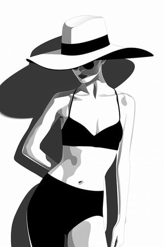Plakat z serii abstrakcja zatytułowany Strój. Prezentuje stylizowany czarno-biały wizerunek kobiety w dwuczęściowym stroju kąpielowym. Postać odziana jest w szerokobrzmiony kapelusz, który rzuca cień na jej twarz, podkreślając elegancki i tajemniczy charakter kompozycji. Kobieta stoi w pozycji trzy czwarte, z jedną ręką opuszczoną wzdłuż ciała, a drugą lekko zgiętą w łokciu, co dodaje dynamizmu ilustracji. Plakat jest utrzymany w minimalistycznym stylu z wykorzystaniem płaskich plam kolorów i wyraźnych linii, co nadaje mu nowoczesny i modny wygląd. Ten rodzaj grafiki idealnie wpasuje się w nowoczesne wnętrza, szczególnie te o monochromatycznej kolorystyce, lub jako modny akcent w przestrzeniach o minimalistycznej estetyce.