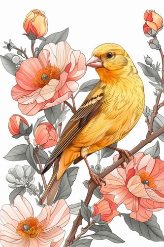 Plakat z serii natura zatytułowany Wiosenny Śpiewaczek przedstawia pełną detali i życia scenę, w której jaskrawo żółty ptak, przypominający kanarka, spoczywa na gałęzi wśród kwitnących kwiatów. Delikatne i subtelne kolory kwiatów w pastelowych odcieniach różu i pomarańczu tworzą miękki kontrast do żywego upierzenia ptaka. Precyzyjne linie i staranne cieniowanie nadają ilustracji realistycznego wyglądu, a roślinność w tle jest równie szczegółowo wykonana, co dodaje kompozycji głębi i bogactwa. Ten plakat to celebracja wiosennego odrodzenia i piękna natury, idealny do ożywienia każdego wnętrza, szczególnie pokoju dziennego, przestrzeni odpoczynkowej lub kawiarni o przytulnej atmosferze.