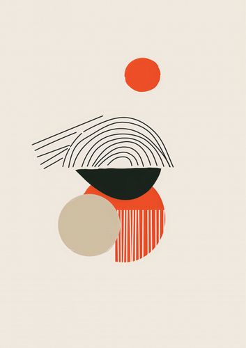 Plakat z serii boho zatytułowany Centralne Słońce to dzieło artystyczne utrzymane w stonowanej palecie kolorystycznej, na którym dominują geometryczne kształty i linie. Na górnej części kompozycji widnieje małe, jaskrawe czerwone koło, które może symbolizować słońce lub inny punkt centralny. Poniżej znajduje się czarna, półokrągła forma z koncentrycznymi liniami, przypominającymi ułożenie naturalnych warstw kamienia lub drzewa. Tuż obok, kontrastujące z nią, znajduje się większe, jasno beżowe koło, które wraz z czarnym półkolem tworzy iluzję przestrzeni. Na dole plakatu uwagę przyciąga większe, okrągłe pole w odcieniu ciepłego pomarańczu, na którym znajduje się wzór pasków w kierunku pionowym, dodający tekstury i ruchu. Całość utrzymana jest w estetyce minimalizmu i modernizmu, gdzie każdy element, choć prosty, jest starannie wyważony, by współgrać z resztą kompozycji.