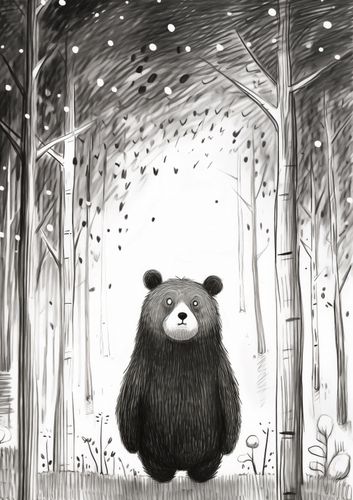 Plakat z serii wnętrza zatytułowany Ciekawski Miś. Ten uroczy plakat ilustracyjny przedstawia przyjaznego, czarno-białego misia stojącego na dwóch nogach w środku leśnej polany, patrzącego z ciekawością w górę na delikatnie opadające płatki śniegu. Stylizowany na rysunek piórkiem z miękkimi odcieniami szarości, wprowadza atmosferę spokoju i zaciekawienia naturą. Idealny do ozdoby pokoju dziecięcego, jako element dekoracyjny w przestrzeniach edukacyjnych lub jako ciepły akcent w domowych salonach.