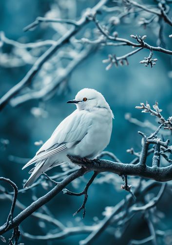 Plakat z serii natura zatytułowany Perłowy Ptak przedstawia urokliwy obraz białego ptaka, który spoczywa na gałęzi drzewa. Ptak, o perłowo białym upierzeniu i przejmujących pomarańczowych oczach, wydaje się być wyizolowany od świata, znajdując ukojenie w zimowej aurze. Tło w chłodnych, niebieskich tonacjach kontrastuje z ciepłym akcentem koloru oczu ptaka, tworząc atmosferę harmonii i spokoju. Delikatne szrony na gałęziach dodają obrazowi delikatności i subtelności, zaś skomponowany w minimalistycznej estetyce, ten plakat jest idealny do wnętrz, które cenią sobie spokój, elegancję oraz kontakt z naturą. Doskonale wpasuje się w przestrzenie takie jak salony relaksacyjne, gabinety terapeutyczne czy nawet jako ukojenie dla oczu w dynamicznie zmieniających się współczesnych biurach.