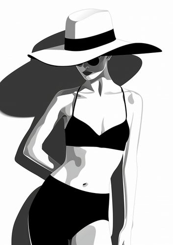 Plakat z serii abstrakcja zatytułowany Strój. Prezentuje stylizowany czarno-biały wizerunek kobiety w dwuczęściowym stroju kąpielowym. Postać odziana jest w szerokobrzmiony kapelusz, który rzuca cień na jej twarz, podkreślając elegancki i tajemniczy charakter kompozycji. Kobieta stoi w pozycji trzy czwarte, z jedną ręką opuszczoną wzdłuż ciała, a drugą lekko zgiętą w łokciu, co dodaje dynamizmu ilustracji. Plakat jest utrzymany w minimalistycznym stylu z wykorzystaniem płaskich plam kolorów i wyraźnych linii, co nadaje mu nowoczesny i modny wygląd. Ten rodzaj grafiki idealnie wpasuje się w nowoczesne wnętrza, szczególnie te o monochromatycznej kolorystyce, lub jako modny akcent w przestrzeniach o minimalistycznej estetyce.
