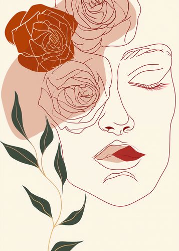 Plakat z serii abstrakcja zatytułowany Beż i Twarz. Plakat przedstawia stylizowany, linearny portret kobiety z zaznaczonymi konturami w ciepłych odcieniach beżu i różu. Twarz kobiety jest uchwycona w profilu, z subtelnymi detalami takimi jak delikatnie zamknięte oko, zarysowane usta oraz zaznaczone linie nosa i brwi. Kompozycja łączy w sobie elementy botaniczne – różę umieszczoną w górnej części obok głowy, co nadaje dziełu romantyczny i subtelny charakter. Liście i łodyga róży wiodą wzrok od dolnej części plakatu aż po jej głowę, tworząc spójną, pionową linię. Użyte kolory są ograniczone do kilku pastelowych odcieni, co sprawia, że plakat jest zarówno spokojny, jak i elegancki. Idealnie sprawdzi się jako element dekoracyjny w przestrzeniach nowoczesnych, jak i tych urządzonych w stylu vintage.
