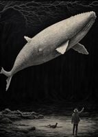 Plakat z serii abstrakcja zatytułowany Biały Wieloryb. Ta tajemnicza i prowokująca grafika przedstawia surrealistyczne spotkanie człowieka z ogromnym wielorybem w ciemnym, leśnym otoczeniu. Monochromatyczna paleta barw i szczegółowe tekstury nadają tej scenie wygląd ręcznej ilustracji. Wieloryb, unoszący się w powietrzu, stwarza wrażenie ciszy i spokoju, podczas gdy postać człowieka, zwrócona ku niemu, wprowadza element refleksji i głębokiej łączności z naturą. Plakat ten jest idealnym wyborem dla miłośników sztuki, którzy cenią sobie niestandardowe i głębokie przesłanie, doskonale nadaje się do osobistych przestrzeni medytacyjnych, nowoczesnych salonów, czy jako mocny akcent w galeriach sztuki.