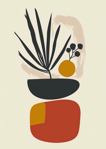 Plakat z serii boho zatytułowany Botaniczny Wgląd.Grafika łączy organiczną formę roślin z abstrakcyjnymi, geometrycznymi kształtami, tworząc kompozycję, która jest zarówno nowoczesna, jak i naturalna. Czarne, eleganckie liście wyłaniają się z ciemnej, okrągłej doniczki, kontrastując z ciepłymi odcieniami pomarańczu i żółci, które mogą symbolizować słońce lub owoc. Delikatne, nieregularne pociągnięcia pędzlem w tle nadają dziełu głębi i tekstury, dodając do czystych linii i bloków kolorów ciepło i ruch.Plakat wprowadzi do wnętrza życie i sztukę w dosłowny sposób, będąc idealnym akcentem w przestrzeniach, gdzie chce się połączyć sztukę współczesną z elementami naturalnymi, takimi jak salony, przestrzenie mieszkalne, czy biurowe, a nawet miejsca takie jak kawiarnie i butiki, które cenią sobie spokój i harmonię.