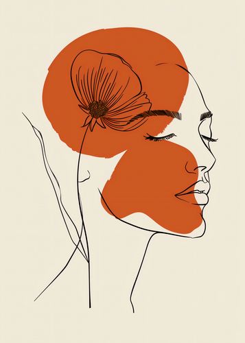 Plakat z serii minimalistyczne zatytułowany Ciepło Kwiatu to połączenie delikatności kobiecego profilu z silnym, graficznym motywem kwiatu. Ciepła, pomarańczowa plama w kształcie koła harmonizuje z konturem twarzy kobiety, a umieszczony na niej kwiat stanowi zarówno dekorację, jak i symboliczny akcent. Linie szkicu są subtelne, ale wyraziste, podkreślające spokojne, zamyślone wyrażenie twarzy. Plakat łączy w sobie prostotę z elegancją, idealnie pasując do przestrzeni, gdzie sztuka ma odzwierciedlać spokój i wewnętrzne piękno, takich jak sypialnie, salony, a nawet nowoczesne biura.