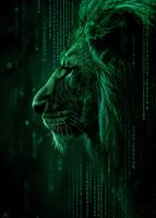 Plakat z serii pop art zatytułowany Kod Siły. Prezentuje majestatyczne oblicze lwa zanurzone w cyfrowym kodzie, który spływa w dół jak deszcz binarny, łącząc siłę i surowość natury z precyzją i logiką technologii. Zielonkawe światło podkreśla kontury i muskulaturę króla zwierząt, a cyfrowe elementy otulają jego profil, sugerując połączenie organicznego i syntetycznego świata. Ten plakat idealnie wpisuje się w nowoczesne, technologiczne przestrzenie, takie jak nowoczesne biura, pokoje gamingowe lub innowacyjne przestrzenie edukacyjne, oferując inspirację i refleksję nad współczesnym związkiem człowieka z technologią.