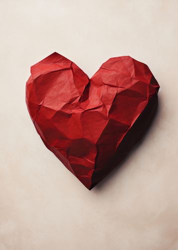 Plakat z serii wnętrza zatytułowany Kreślone Serce. Delikatne fałdy czerwonego papieru układają się w kształt serca, symbolizując skomplikowane, ale głębokie emocje. Nieregularne załamania i zgięcia dodają obrazowi tekstury i głębi, przypominając o wrażliwości i kruchości ludzkich uczuć. Pastelowe tło kontrastuje z intensywną czerwienią, podkreślając subtelność i ciepło kompozycji. Ten wyjątkowy i wzruszający projekt doskonale pasuje do romantycznych sypialni, salonów relaksacyjnych, a także miejsc związanych z terapią emocjonalną i sztuką.