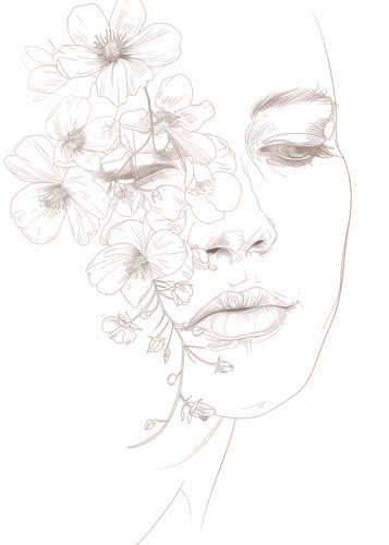 Plakat z serii wnętrza zatytułowany Kwitnąca Imersja przedstawia delikatny, linijny rysunek profilu kobiety, którego twarz częściowo zasłaniają i uzupełniają subtelne kwiaty. Delikatne linie twarzy kobiecej harmonizują z organicznymi kształtami roślin, sugerując jedność z naturą i subtelne piękno. Kwiaty wydają się być naturalnym przedłużeniem jej bytu, dodającym delikatności i eterycznego charakteru całej kompozycji. Ta minimalistyczna, ale wyrafinowana ilustracja emanuje spokojem i ukojeniem, idealna do przestrzeni medytacyjnych, salonów spa, lub jako elegancki element dekoracyjny w nowoczesnych wnętrzach.