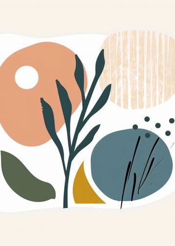 Plakat z serii boho zatytułowany Pastel Owoców.Plakat przedstawia stilizowany obraz natury, gdzie organiczne formy i kształty łączą się w nieoczywisty sposób. W kompozycji dominuje duża, pastelowa forma przypominająca owoce lub słońce, która kontrastuje z subtelnym tłem w delikatnych odcieniach beżu ozdobionym wertykalnymi liniami. Obok widnieją płynne, ciemnozielone liście oraz zaokrąglone, geometryczne formy w odcieniach szarości i musztardy, uzupełnione o subtelne graficzne akcenty. Plakat będzie pięknie komponował się w przestrzeniach poszukujących elementów natury w abstrakcyjnej, uproszczonej formie, idealnie nadając się do nowoczesnych salonów, kreatywnych przestrzeni pracy lub jako delikatny akcent w minimalistycznej sypialni.