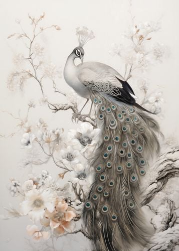 Plakat z serii wnętrza zatytułowany Pawia Gracja. Ta grafika przedstawia majestatycznego pawia spoczywającego na gałęzi, otoczonego przez delikatne kwiaty magnolii. Kunsztownie oddane detale piór i kwiatów w pastelowej palecie barw tworzą uczucie spokoju i harmonii. Plakat ten jest idealny dla miłośników piękna natury i sztuki, doskonale nadaje się do wnętrz o klasycznej i eleganckiej estetyce, takich jak salon, sypialnia, a także jako wyjątkowy element dekoracyjny w spa lub miejscach relaksacji.