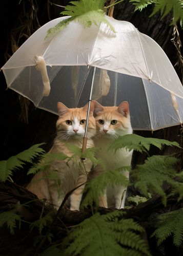 Plakat z serii wnętrza zatytułowany Podwójna Ochrona przedstawia dwie urocze, rude koty szukające schronienia pod przezroczystym parasolem, który zdaje się być koroną zielonej paproci. Ich symetryczne odbicie w połyskliwej strukturze parasola dodaje głębi i charakteru kompozycji. Ciepłe odcienie futra kotów kontrastują z ciemnym, zielonym tłem, co sprawia, że stają się centralnym punktem obrazu. Ich spojrzenia są skierowane prosto w obiektyw, co nadaje fotografii osobisty i intymny charakter. To zdjęcie idealnie uchwyciło moment spokoju i ochrony w naturalnym otoczeniu, a zarazem subtelnie podkreśla więź między dwoma zwierzętami. Idealne do wnętrz o domowym, ciepłym charakterze, zarówno dla miłośników kotów, jak i miłośników przyrody.
