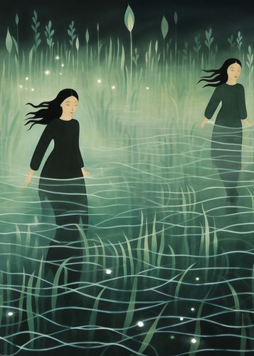 Plakat z serii wnętrza zatytułowany Pośród Ciszy, przedstawia grupę postaci kobiecych, poruszających się z gracją przez mglisty, oniryczny krajobraz. Zanurzone po kolana w wodzie, otoczone przez zielone, eteryczne trawy i dyskretnie świecące światła, postacie emanują spokojem i tajemniczością. Styl plakatu, z jego płynnymi liniami i spokojnymi odcieniami zieleni, tworzy uczucie medytacyjnej głębi i harmonii z naturą. Ten plakat idealnie nadaje się do wnętrz, które pragną odzwierciedlić głęboką spokojność i introspekcję, takich jak pokoje medytacyjne, strefy relaksu, domowe biblioteki, a także jako subtelny akcent w przestrzeniach publicznych, gdzie zachęca do chwili wytchnienia i refleksji.