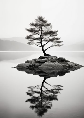 Plakat z serii pejzaże zatytułowany Samotne Drzewo to monochromatyczne zdjęcie prezentujące unikalną scenę – pojedyncze drzewo wyłaniające się z kamiennej wysepki na tle spokojnej, lustrzanej powierzchni wody. Plakat jest ujęciem w tonacji czerni i bieli, co nadaje mu ponadczasowy charakter i podkreśla minimalistyczną estetykę. Silny kontrast między ciemnymi konturami drzewa a jasnym tłem wody tworzy głębię i przykuwa uwagę. Odbicie drzewa w wodzie tworzy symetryczny i spokojny obraz, który może wnosić element spokoju i zamyślenia do każdego otoczenia. Ten plakat będzie doskonałym wyborem dla osób ceniących naturę, minimalizm oraz sztukę fotograficzną, idealny do powieszenia w salonie, biurze, czy jako element dekoracyjny w przestrzeniach wellness i spa.