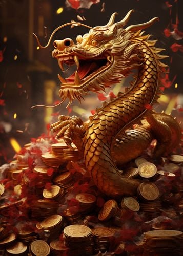 Plakat z serii motywy wschodnie zatytułowany Smok Bogactwa. Ilustracja ta ukazuje potężnego złotego smoka, symbol siły i pomyślności w wielu kulturach wschodnich, unoszącego się nad skarbami. Smok, z szeroko otwartymi szczękami, wydaje się ryczeć triumfalnie, otoczony przez wirujące złote monety i kwiaty, co dodaje kompozycji dynamizmu. Żywe kolory i szczegółowe wykonanie smoka sprawiają, że plakat jest pełen życia i energii. Plakat ten jest doskonałym wyborem dla miłośników sztuki orientalnej oraz jako element dekoracyjny wnętrz, które chcą wprowadzić elementy bogatej symboliki i kulturowej głębi, takich jak domowe biura, pokoje do medytacji czy ekskluzywne salony.