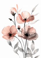 Plakat z serii wnętrza zatytułowany Subtelny Okaz to artystyczna interpretacja delikatnych kwiatów maku. Ilustracja przedstawia kwiaty w pastelowych odcieniach różu i pomarańczy z subtelnymi szarości i akcentami czerni, co nadaje kompozycji miękkiego i eterycznego charakteru. Przezroczyste płatki z lekko zarysowanymi konturami są przedstawione na tle w tonacji jasnego beżu, co pozwala na pełne skupienie na delikatności i pięknie kwiatów. Wykorzystanie minimalizmu i delikatności kolorów sprawia, że plakat emanuje spokojem i elegancją. Idealny do przestrzeni, które cenią sobie spokój i naturę, takich jak salony spa, pokoje gościnne, czy jadalnie, gdzie może dodać odrobinę subtelnego uroku i świeżości.